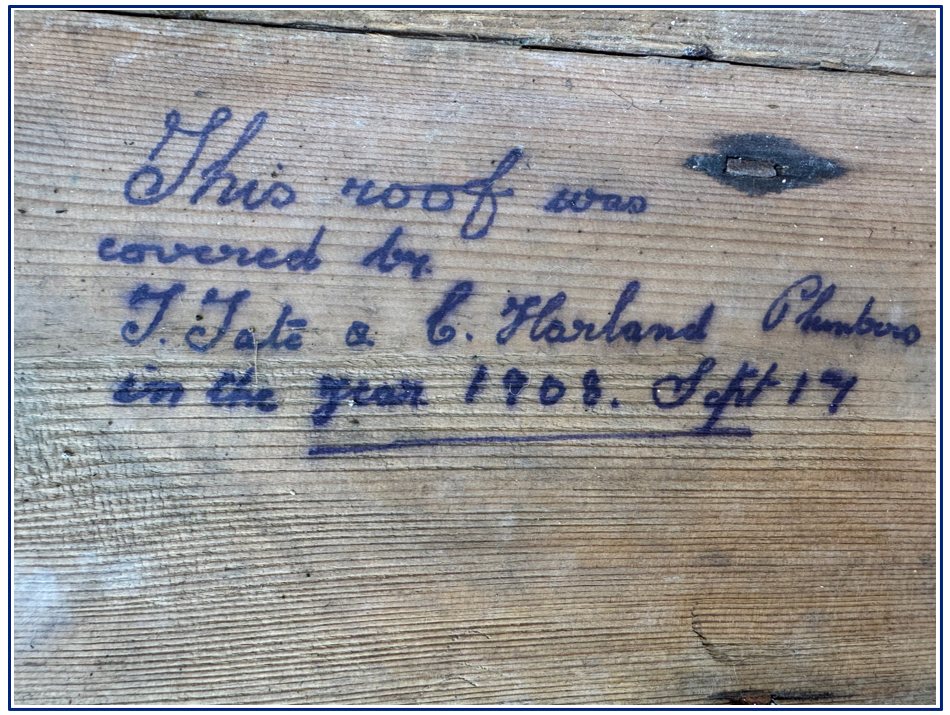 The south aisle roof has also been fully stripped, revealing some interesting discoveries on the old sarking boards.